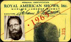 Johanns ID-cards Membership Card in Greater Tampa Showmen's Ass'n. Personal Identification from Royal American Shows, Inc. Johanns Driver License Card.