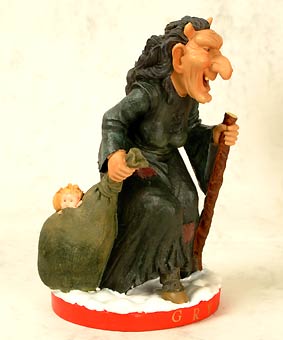 (Mynd eftir Tryggva Magnússon) Grýla Er þekkt sem flagð frá 13. öld , það er minnst á hana sem tröllkvendi í SnorraEddu, en það er ekki fyrr en á 17.-18 sem hún er bendluð við jólin og þá sem barnaæta. Í kvæðum og sögum af Grýlu þá hefur hún oftast ekki erindi sem erfiði og þarf alltaf að láta í minni pokann.Orðið sjálft merkir einna helst , ógn, hótun eða hryllingur. Fyrst fréttist af jólasveinum á 17. öld sem afkvæmi Grýlu og miklu illþýði. Þeir taka nokkuð að mildast á 19. öld, koma þá ýmist af fjöllum eða af hafi, eru oftast 9 eða 13. Spurnir eru af rúmlega sjötíu jólasveinanöfnum. Grýla er sá gestur jólanna sem er talinn hvað skelfilegastur. Hún er tröllkerling, sem heyrir í óþekkum börnum yfir holt og hæðir, skellir þeim í pokann sinn og þau enda svo í stóra pottinum hennar. Í mínum huga er Grýla alltaf með pokann á bakinu, tilbúinn ef heyrist í óþekkum krakka, hún er líka alltaf svöng, endalaust hungur sem hrjáir hana. Sumar lýsingar á Grýlu er svakalegar, jafnvel að hún sé marghöfða djöflakerling, hafi marga langa hala. ( Sjá ) "Hún hefur hala og hófa í stað fóta. Hún er geysistór með svakalegar hendur sem hún grípur óþekku börnin með og kartnögl á hverjum fingri. Hún hefur skögultennur og mikið og bogið nef alsett vörtum. Hún hefur brennandi augnaráð og geysigóða heyrn." Enn þann dag í dag er Grýla notuð á saklaus börnin ef þau eru ekki stillt eða hlýðin. " Nú fara Grýla og jólasveinarnir að fylgjast með - Það styttist í að það eigi að setja skóinn út í glugga, nú er eins gott fyrir ykkur að hlýða annars......! " Eitthvað í þessum dúr heyrist á heimilum í dag.....eða hvað. Þó svo að sumir haldi að Grýla sé dauð... myndi ég taka þeim fréttum með varúð. Þegar ég var krakki og langt fram á unglings ár fannst mér þessi mynd hans Tryggva hér að ofan vera hræðileg og önnur mynd sem ég vona að ég finni og fái leyfi fyrir að hafa á síðunni, ég vildi helst ekki sjá þessar myndir því ég varð bókstaflega mjög hræddur. ( í dag þykir mér vænt um þessar myndir ) J.J